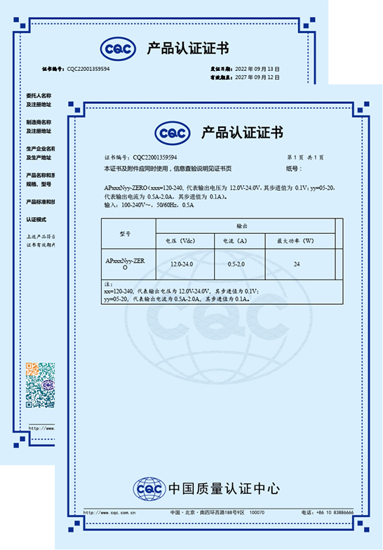 熱烈祝賀我司AP120N20-Zero、AP150N16-Zero、AP200N12-Zero、AP240N10-Zero等型號AC-DC電源模塊順利通過CQC認證,提高了產品競爭力和企業形象,增強客戶對產品的信心。