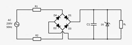 AC-DC電源電阻降壓電路拓撲如上所示,其中電阻R1是降低大部分輸入電源電壓的關鍵元件?,F在要做的是計算R1的值以降低電壓,從而在特定電流值下獲得所需的負載兩端電壓。該電路首先通過R1分壓,之后通過橋式整流器將交流電轉換為直流電,然后是電容濾波和齊納穩壓二極管進行穩壓輸出。