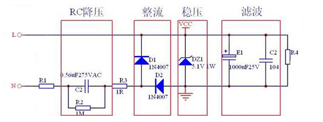 阻容降壓無需變壓器從而將AC轉換為DC,缺點是有負載電流的限制,安全問題等。適合較小負載電流的設備,如小家電面板控制、LED等。